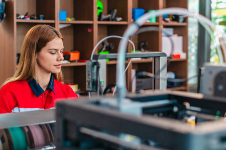 Female industrial designer works with 3D printer in design lab, showcasing integration of design and advanced manufacturing technology. The practical application of 3D printing in product development