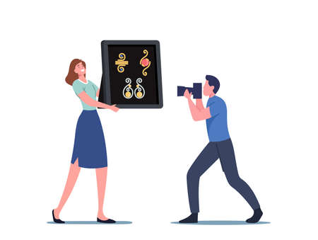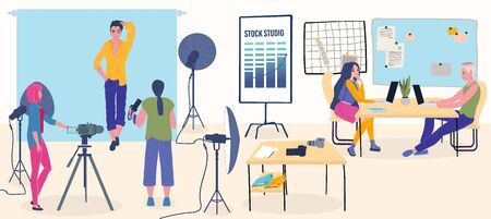 Photo studio professional photographers with camera taking pictures of model with photographic equipment vector Illustration. Photo session and designers at laptops working with pictures.