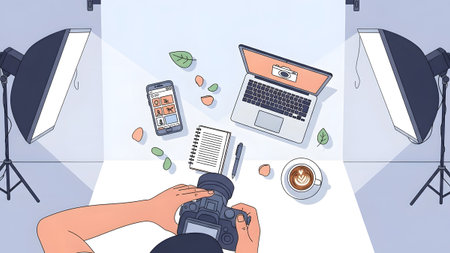 A content creator's desk is neatly organized with essential photography gear and modern technology.