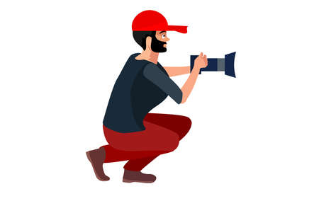 Photographer taking photo. Photojournalist with red cap, in squatting pose documenting plot. Characters Journalist reporters. Cartoon flat vector illustration