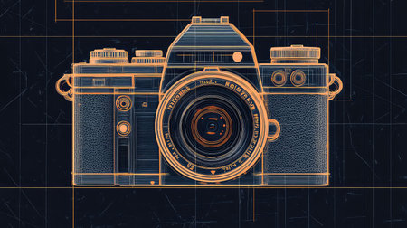 Black film camera on an orange background. Flat lay. Top view. Copy space