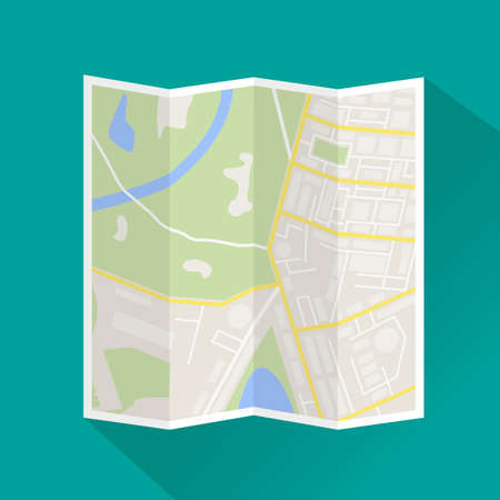 Folded paper city map. Abstract generic city map with roads, buildings, parks, river. City map icon with long shadow. Street map and direction. vector illustration