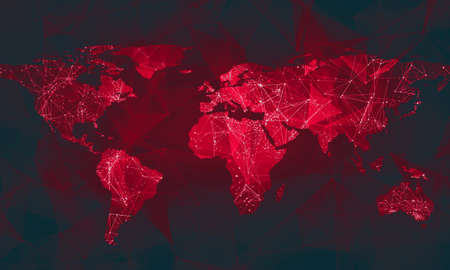 Low-poly image of world map with lights, communication. Wireframe concept of the world network.