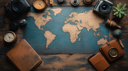 A captivating flat lay of travel essentials displayed on a rustic wooden table. The world map, camera, notebooks, and glasses create a perfect setting for planning adventures.