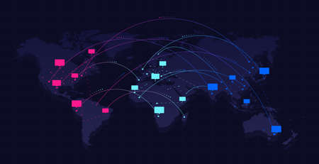 Abstract world map featuring colorful location pins and thin lines connecting various points, illustrating global interactions and connections.