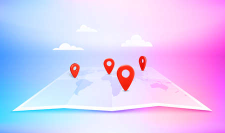 Map navigation red pointers on the road in perspective. Travel destination concept. vector 3d illustration