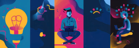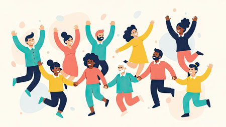 A vector illustration depicts a diverse group of people joyfully holding hands and celebrating. The image showcases various skin tones and attire, with bright colors and a cheerful composition. This visual could be used for themes of community, teamwork, and inclusivity, suitable for a variety of editorial or commercial purposes.