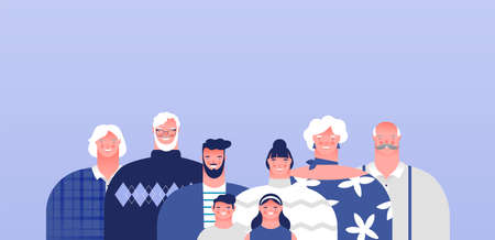 Big happy family people set with empty copy space background. Families ancestry or modern household concept. Includes mom, dad, grandparents and children.