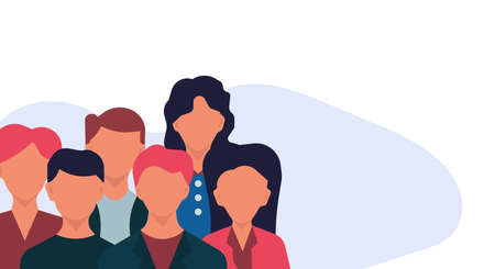 Young people. Happy men and women standing together. Group diverse concept. Family team. Community collaboration. Multicultural persons gathering. Bright colors. Vector flat design