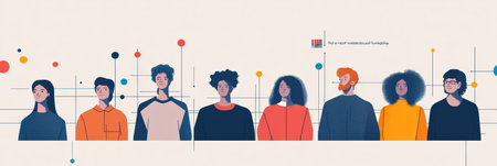 A diverse group of people are depicted standing closely together, smiling, and looking forward. The illustration features vibrant colors and a clean style. The composition suggests unity and support. The artwork could be used in projects focusing on community, equality, or teamwork, and is suitable for various editorial and commercial applications.