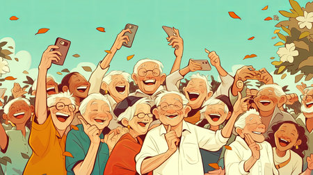 A lively group of elderly individuals capturing a happy moment together using smartphones outdoors, surrounded by positive energy. The scene conveys themes of togetherness, happiness, and the embrace of modern technology.