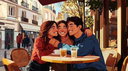 Three friends reconnect with joyful smiles and warm hugs at a bustling outdoor café celebrating their reunion after a time apart. Laughter fills the air as they enjoy their time together.