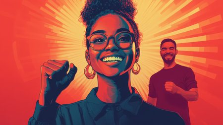 Two individuals share uplifting energy in a creative urban environment, with a backdrop of bright colors and dynamic lighting enhancing their joyful expressions of strength and unity.