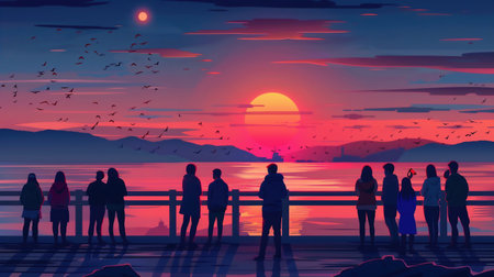 People watching sunset at sea. Characters from behind, looking and enjoying evening sky, sun, standing on deck, pier. Seaside landscapes, travel posters set. Flat graphic