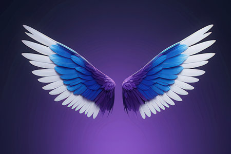 3d rendering of a blue and white angel wings on a purple background