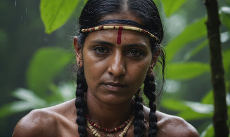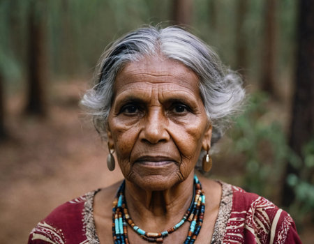 Elderly indigenous woman with traditional facial markings, contemplative gaze in the forest