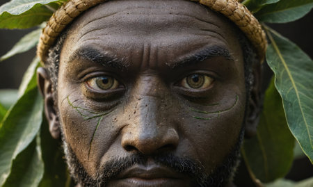 Tribal face paint portrait. Close-up of person with vivid red, green and white plant-inspired facial decorations and beaded necklaces against lush tropical forest background.