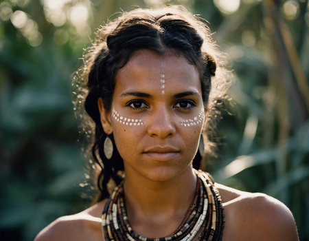 Embodying her heritage, a young Aboriginal Australian woman gazes confidently at the camera, showcasing intricate body art and vibrant accessories amidst a lush backdrop.
