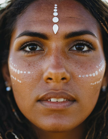 A young Aboriginal Australian woman gazes confidently at the viewer, her face elegantly decorated with traditional body paint.