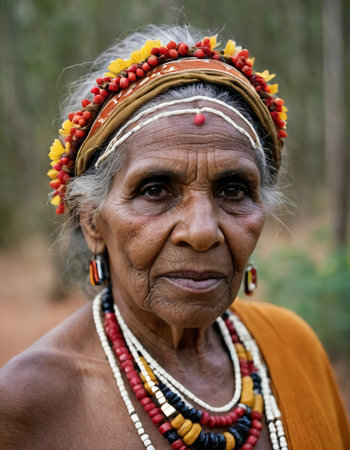 A wise Aboriginal Australian woman stands proudly in a tranquil forest, wearing vibrant traditional jewelry that reflects her rich cultural heritage. The natural beauty surrounds her.