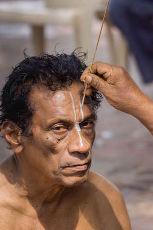 Trichy, India - October 15, 2013: Closeup of mans face while a guru paints the Vishnu symbol in white on the mans forehead at Amma Mandapam. This is part of a religious ritual performed by guru.