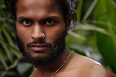 Close-up portrait of man with beard and nose ring looking at camera surrounded by greenery creating natural aesthetic with intense expression.