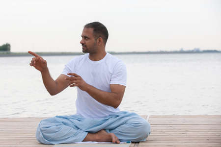 fitness, sport, yoga and healthy lifestyle concept - close up of people meditating in easy sitting pose on river or lake berth. Portrait