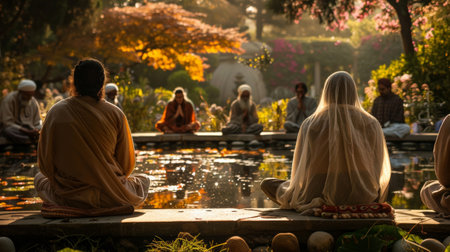 Picture a serene moment where individuals from various faiths gather in a peaceful garden. Capture the essence of unity, respect, and shared spirituality.
