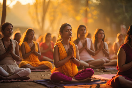 Yoga festival in India. Participants practicing yoga poses amidst natural surroundings.Generated with AI