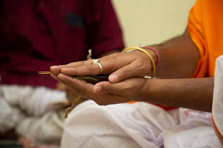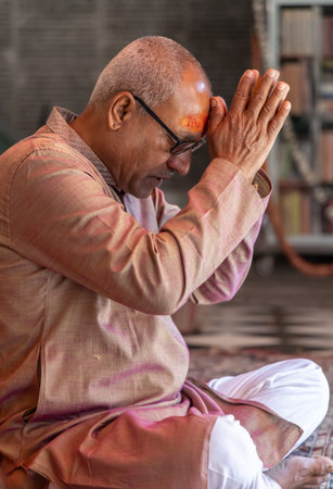 Indian Hindu sadhu man is meditating with his eyes closed, his palms pressed together in prayer