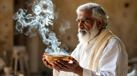 Spiritual ritual: elderly man holding incense bowl in meditative ceremony.