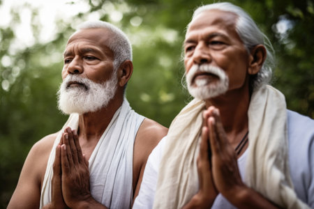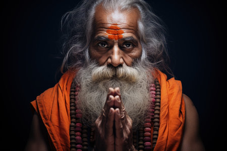 Two devout Hindu holy men wearing vibrant orange robes share a moment of prayer. Their serene expressions and traditional attire reflect spirituality and cultural heritage.