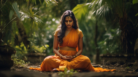 A woman in a yellow sari is praying. Concept of peace and spirituality