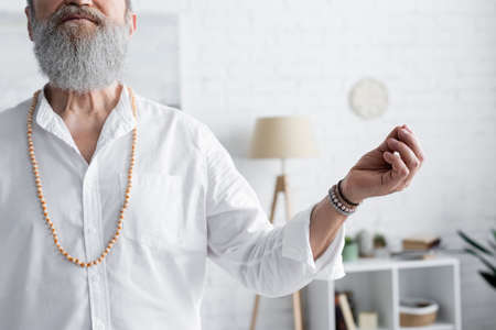 cropped view of guru man in beads showing chin mudra while meditating at home