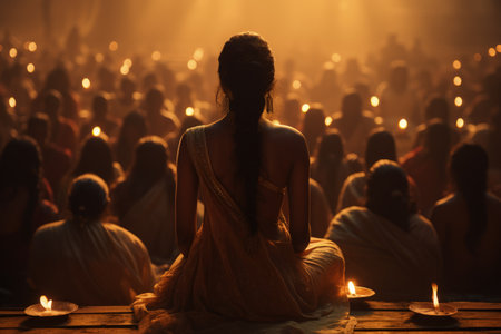 Two women engage in a peaceful moment of prayer, wearing traditional attire, adorned with jewelry, and surrounded by a calming light, evoking spirituality and reflection.