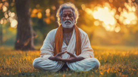 An Indian yogi is deeply engaged in meditation while sitting outdoors in a serene natural setting. He is dressed in traditional white attire, with a peaceful and content expression on his face.