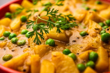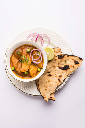 potato curry or aloo masala or alu masala with green peas, served with indian bread or roti or naan