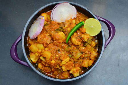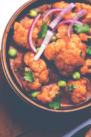 Aloo Gobi matar is a famous Indian curry dish with potatoes and cauliflower and green peas, selective focus