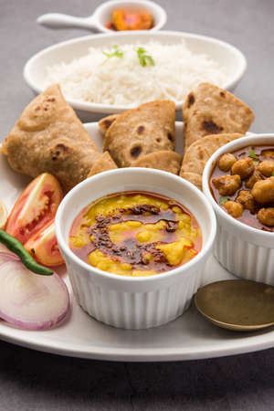 Indian Food Platter or Vegetarian Thali includes Dal Fry, Rice, Chapati and a type of vegetable with salad