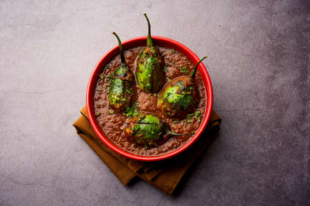 Brinjal curry also known as spicy baingan or eggplant masala, a popular main course recipe from India served in a bowl, karahi or pan