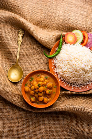 Indian food chole chawal or spicy Chickpea curry with plain rice served with green salad. selective focus