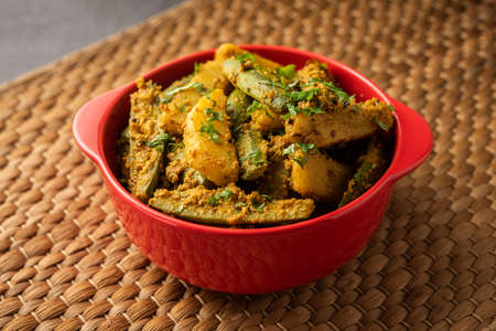 Indian masala fried bhindi or bhendi or Okra or ladyfinger curry or sabji, selective focus
