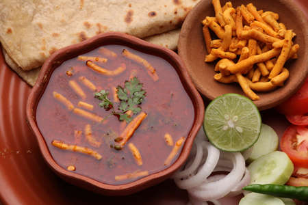 Dhaba style Sev bhaji/sabzi/curry made in tomato curry with gathiya shev, served with chapati/ roti.
