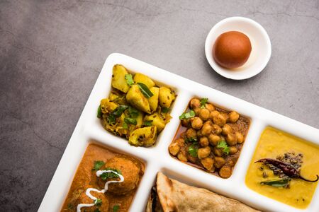 Indian vegetarian Food Thali or Parcel food-tray with compartments in which Malai Kofta, chole, Dal tarka, dry aloo sabji, chapati and rice with sweet gulab jamun served