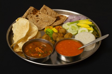 Thali - Traditional Indian Food. Steel tray with multiple compartments for rice, dal, vegetables, roti, papad, dahi, small amounts of chutney or pickle, and a sweet dish.