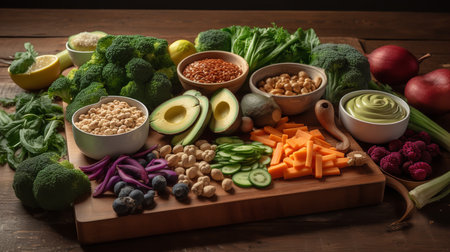 A diverse composition of nutritious food items elegantly presented in a balanced arrangement.