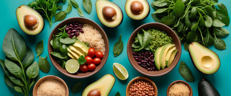 Vibrant vegan meal with avocados, greens, and grains on teal background.