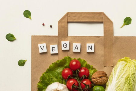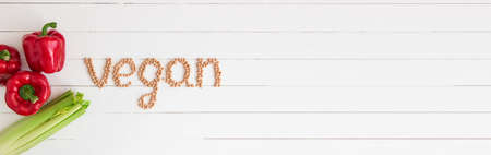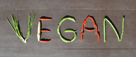 The word vegan written with vegetables on a wooden background