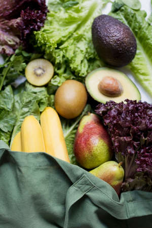 Various fruits and green salad leaves in green shopping bag. Healthy food concept. Farm market delivery