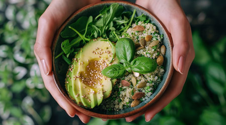 Close-up photo of hands holding a bowl of quinoa, avocado, and greens.